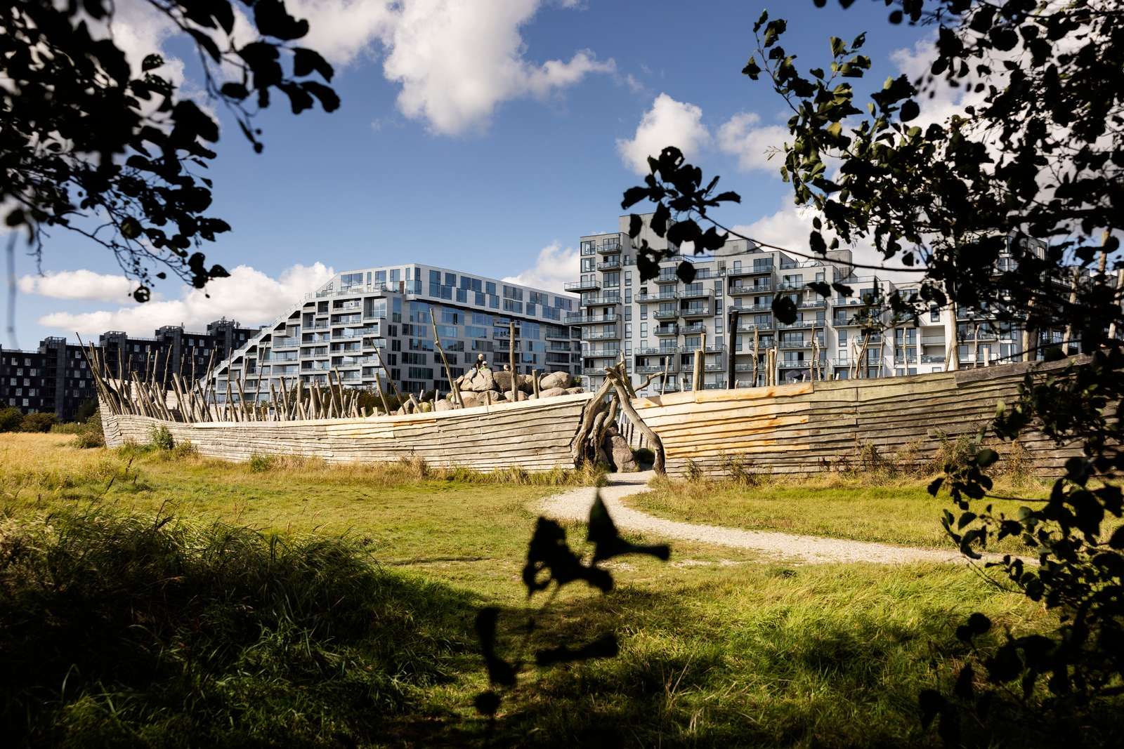 Legepladsen består af Amagerarken, der er bygget som et stort skib du kan klatre op på. Inde i skibet står en stenhøj, som du kan gå op ad via en snoet vej. Nær ved ligger en stammeskov, der består af høje sorte træstammer, som står i en rundkreds.