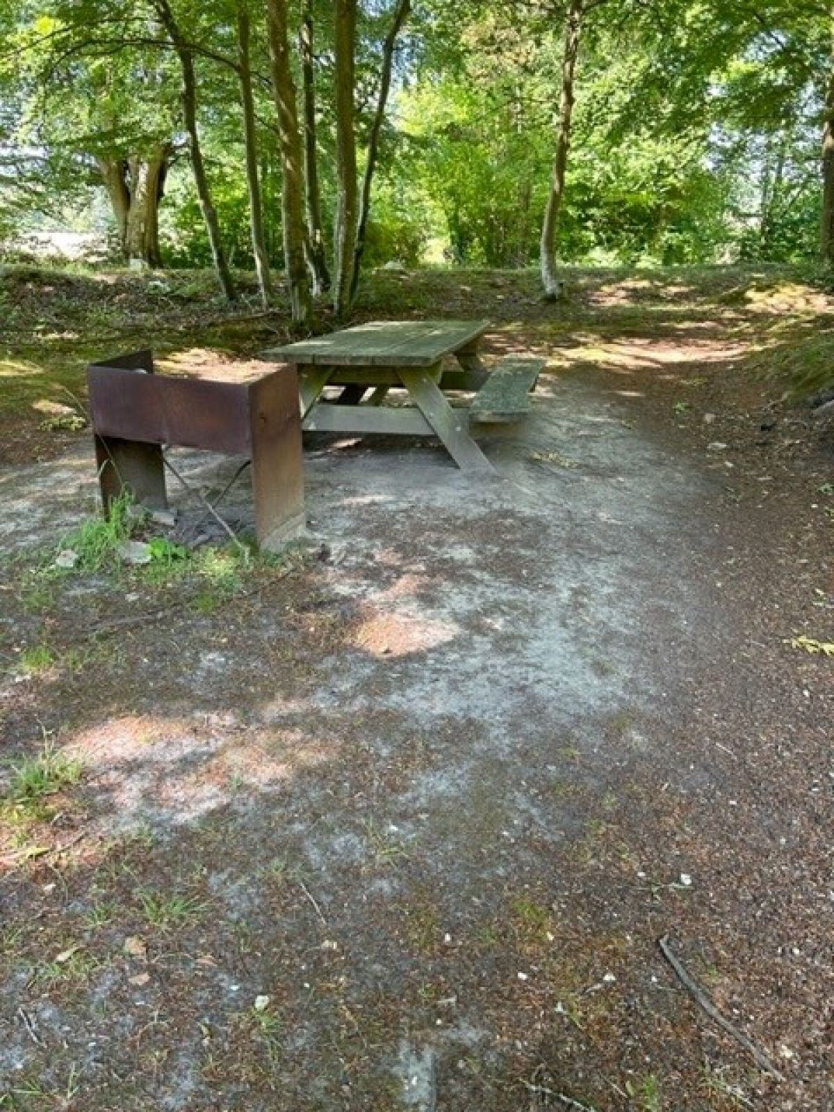 Ved parkeringspladsen er det et bordbænksæt og en grill.