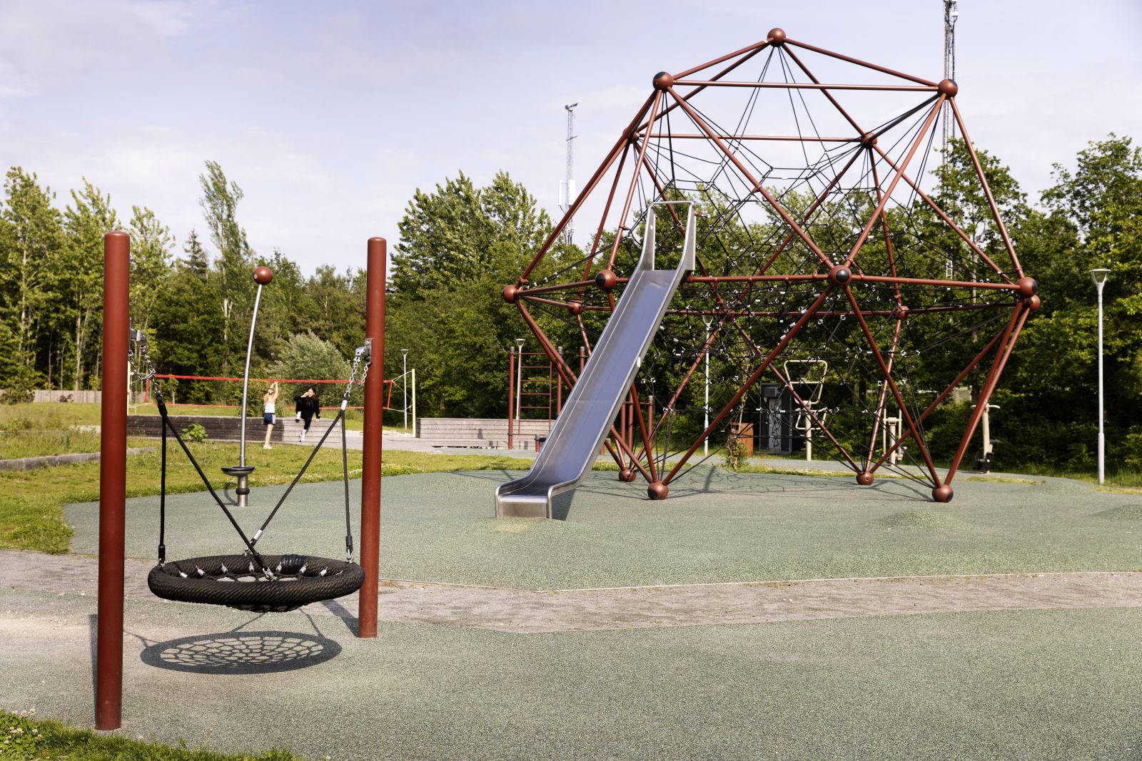 Det er muligt at lege og udfordre sit mod ved at kravle op i den store spaceball og tage rutsjebanen ned. På området finder du også gynger, legehus, trampoliner, klatrenet, opholdspladser, motionsudstyr og beachvolley.