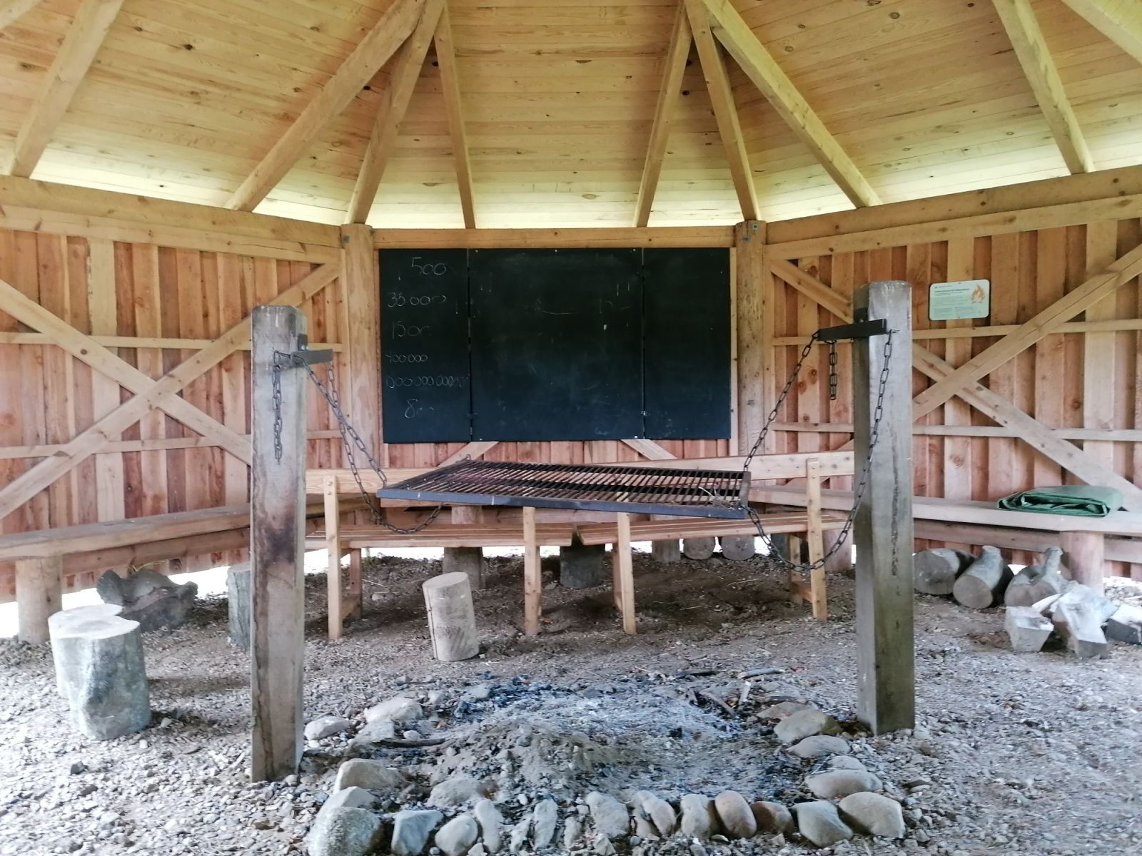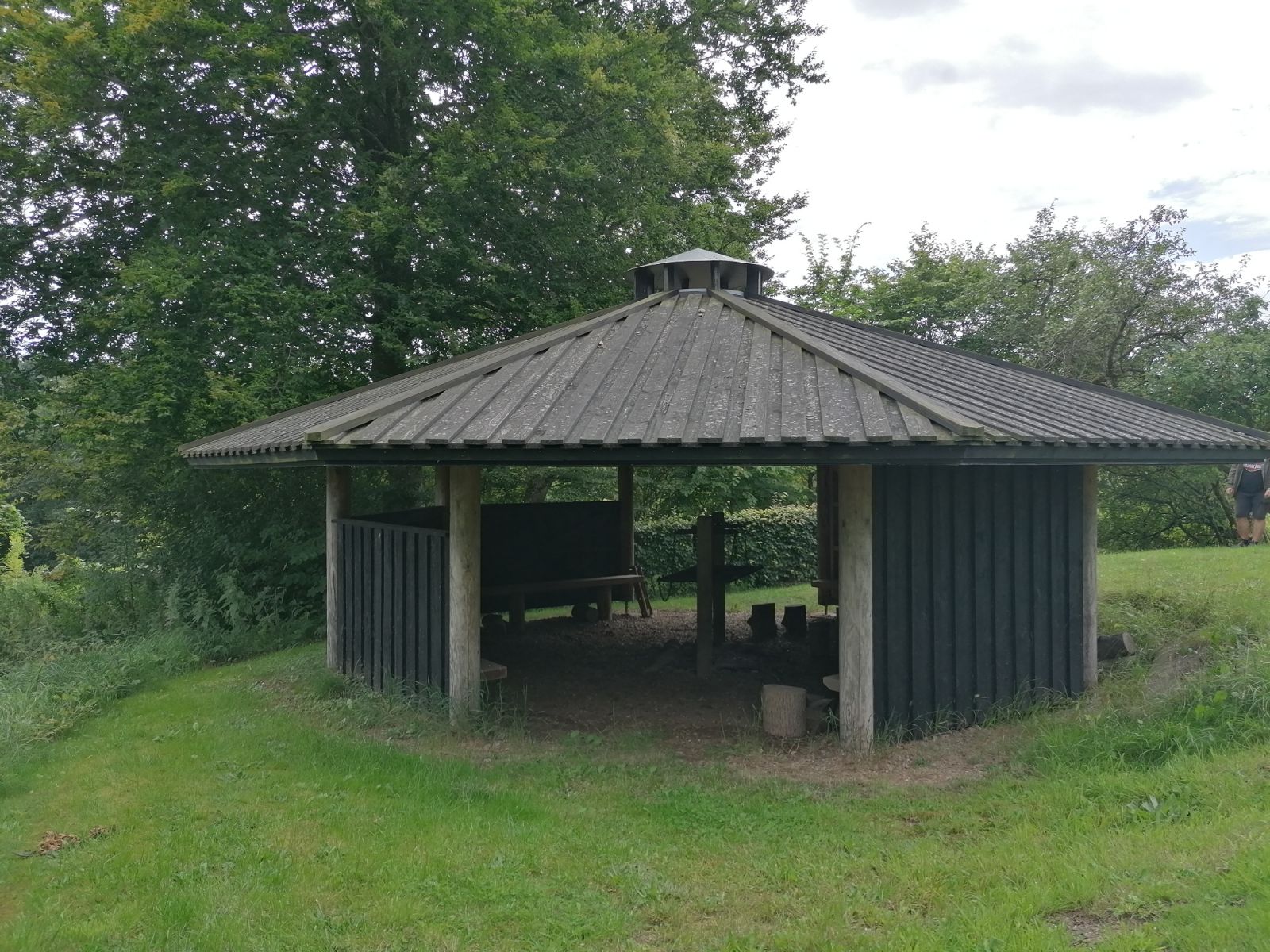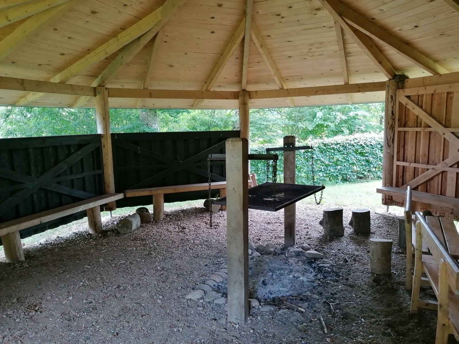 Bålhus med centralt placeret grill og bænke langs vægen. Plads til ca. 15-20 personer under tag.