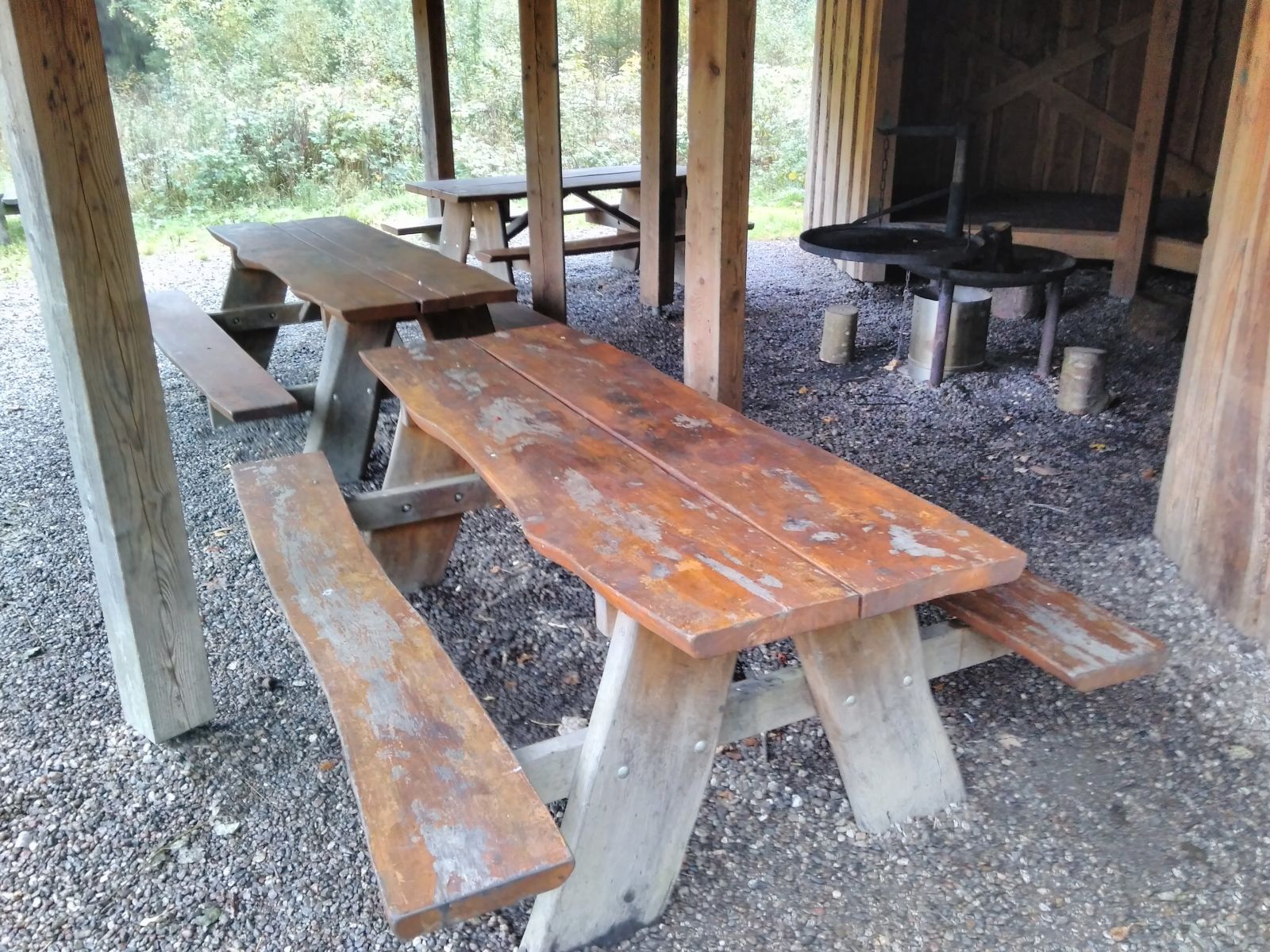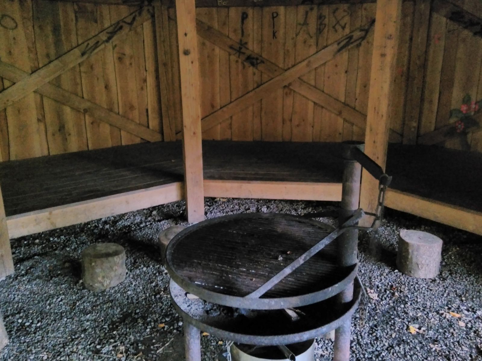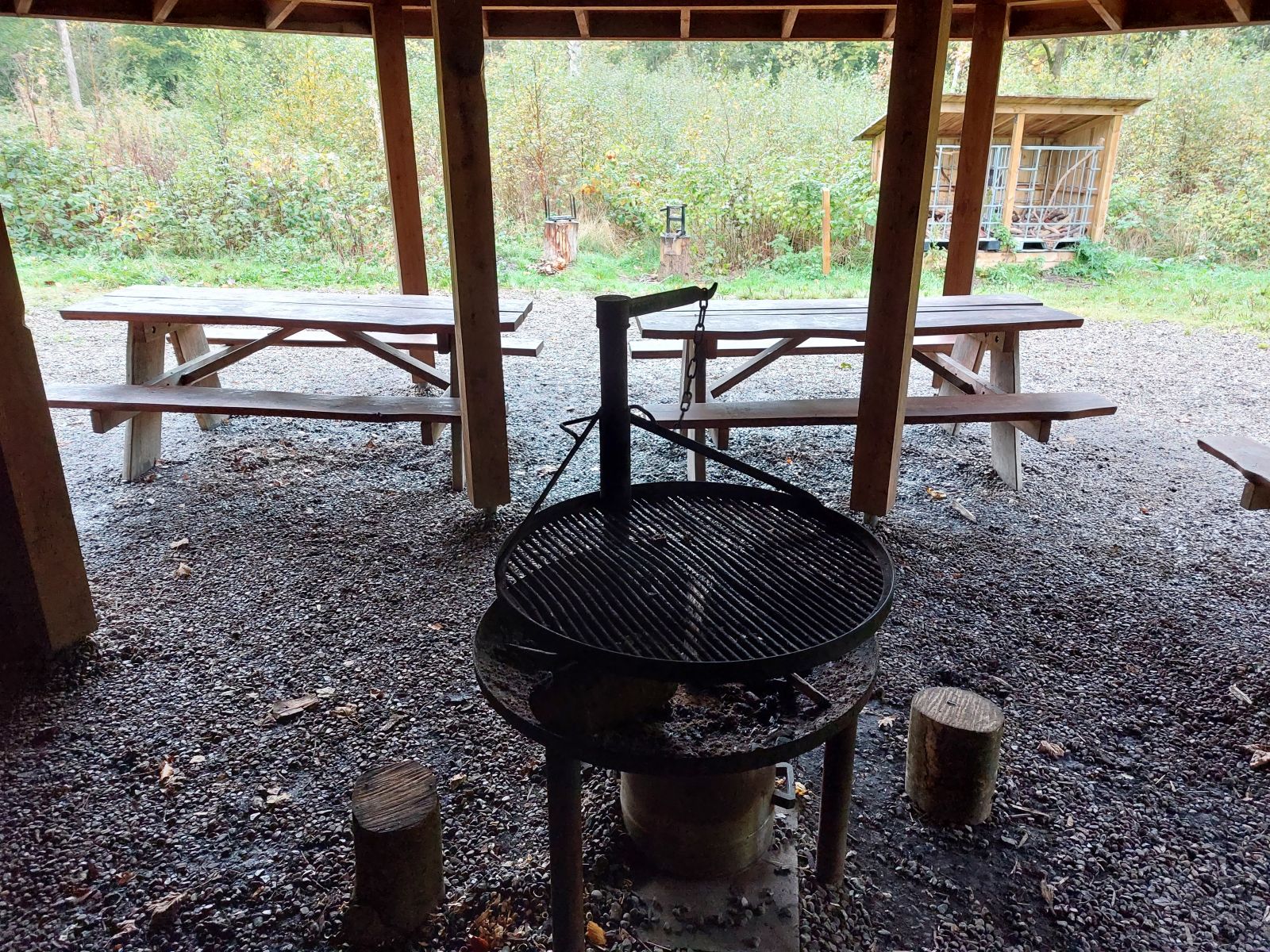 Bålhus med integrerede shelters med plads til 12-15 personer. Med bål-/grillplads samt bord-bænksæt under tag.