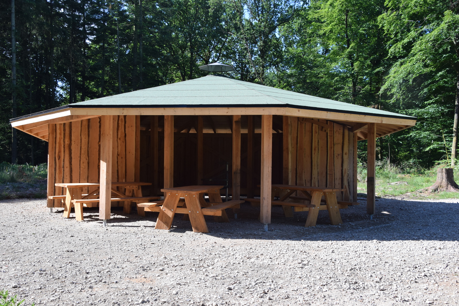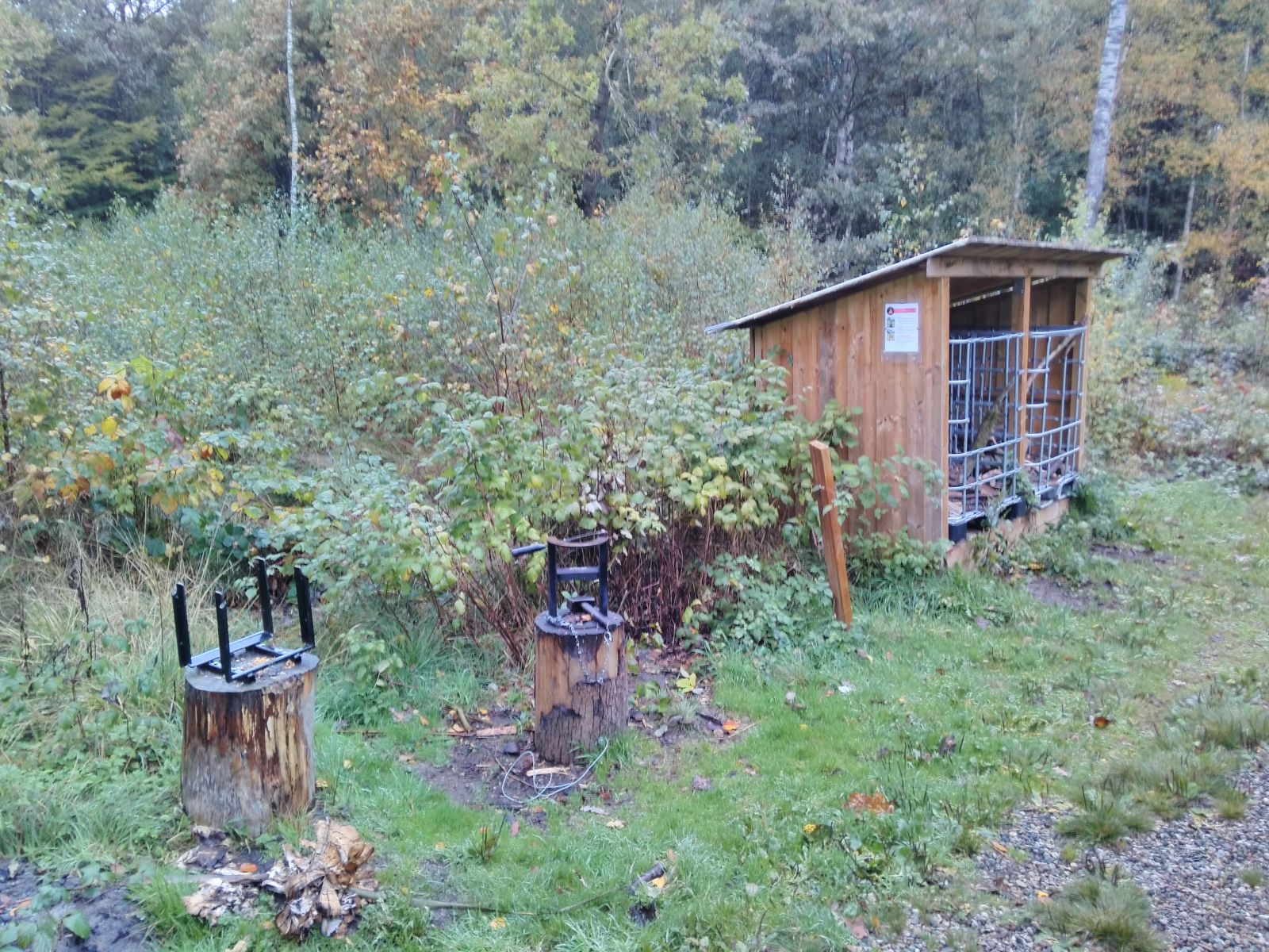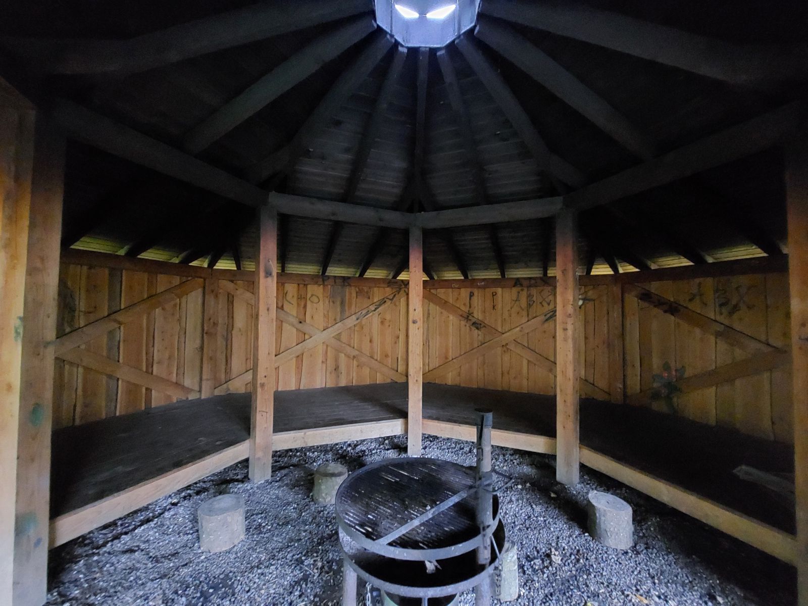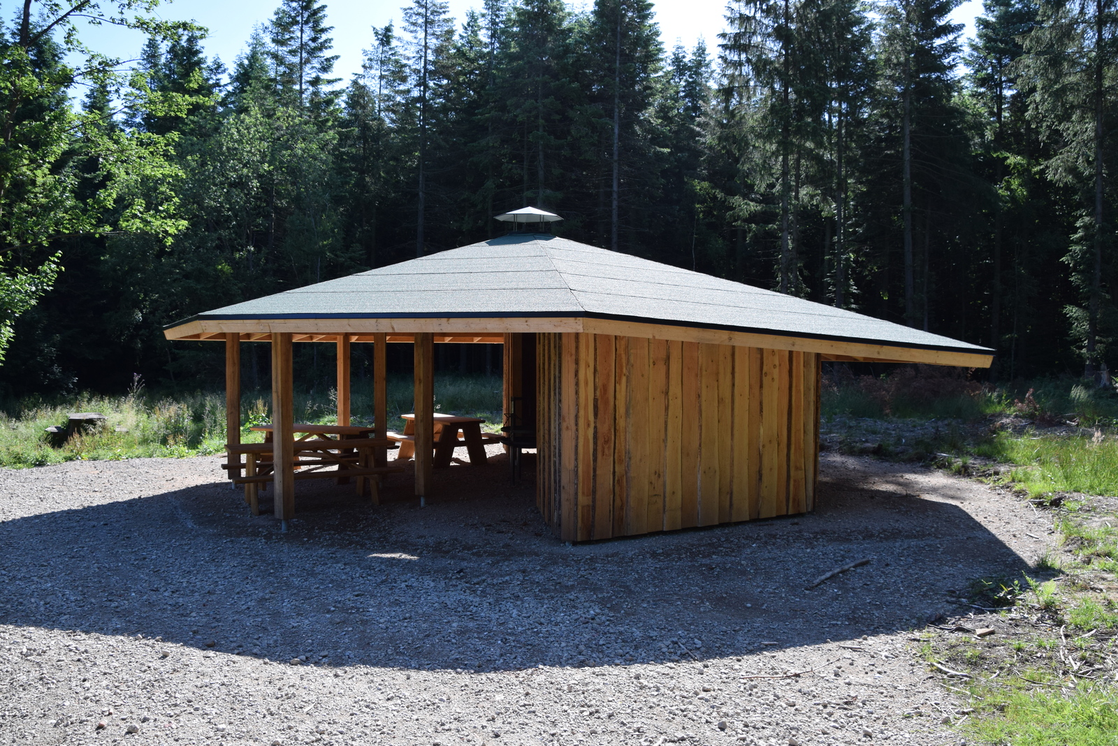 Bålhus med integrerede shelters med plads til 12-15 personer. Med bål-/grillplads samt bord-bænksæt under tag.