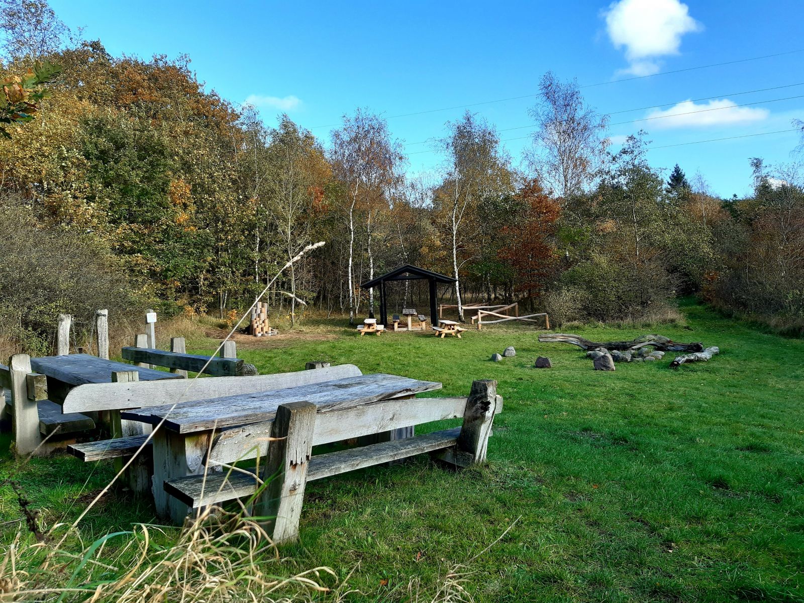 Der er frokosthytte, enkelte legeredskaber samt borde og bænke på pladsen.