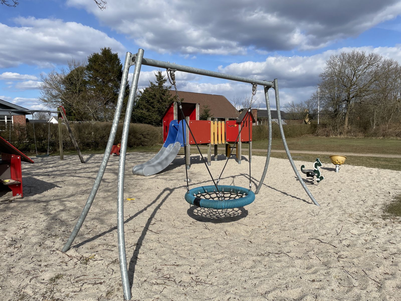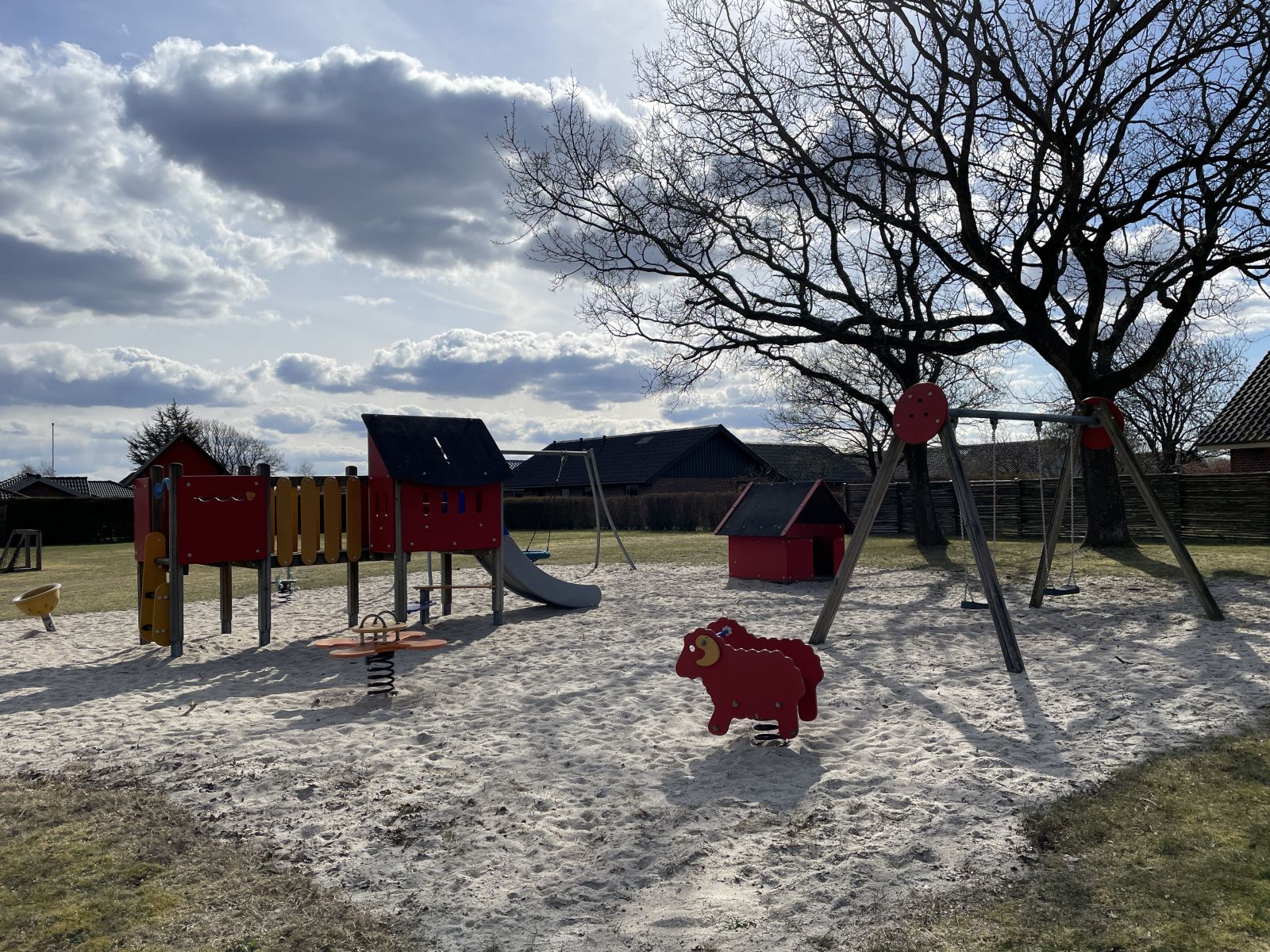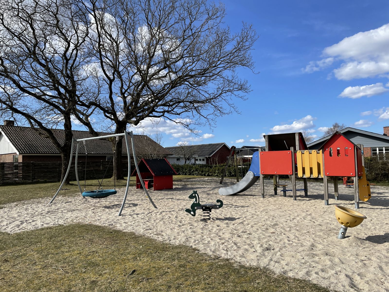 Legepladsredskaber: Fritstående rutjebane - Vippekryds - Gynge med fuglerede - Gyngestativ - Vippedyr får - Spinner Bowl - Vippedyr - Legehus - Klatre redskab med rutsjebane