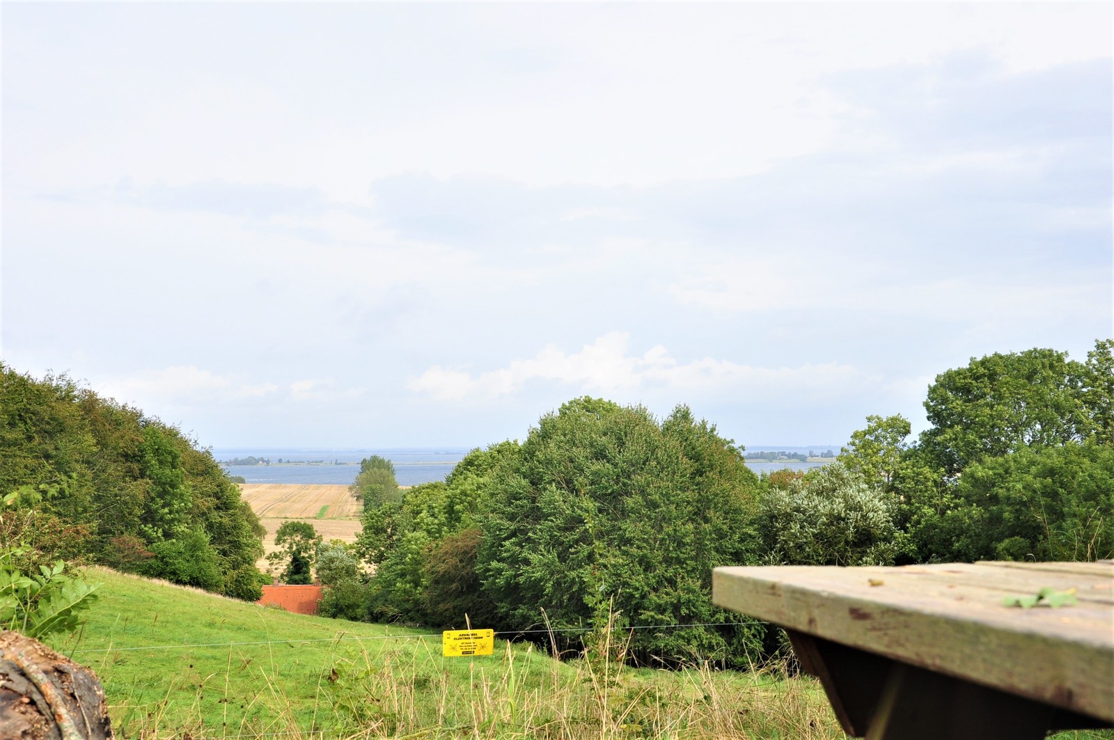 Der er parkeringsplads ved skoven med et bordebænkesæt.