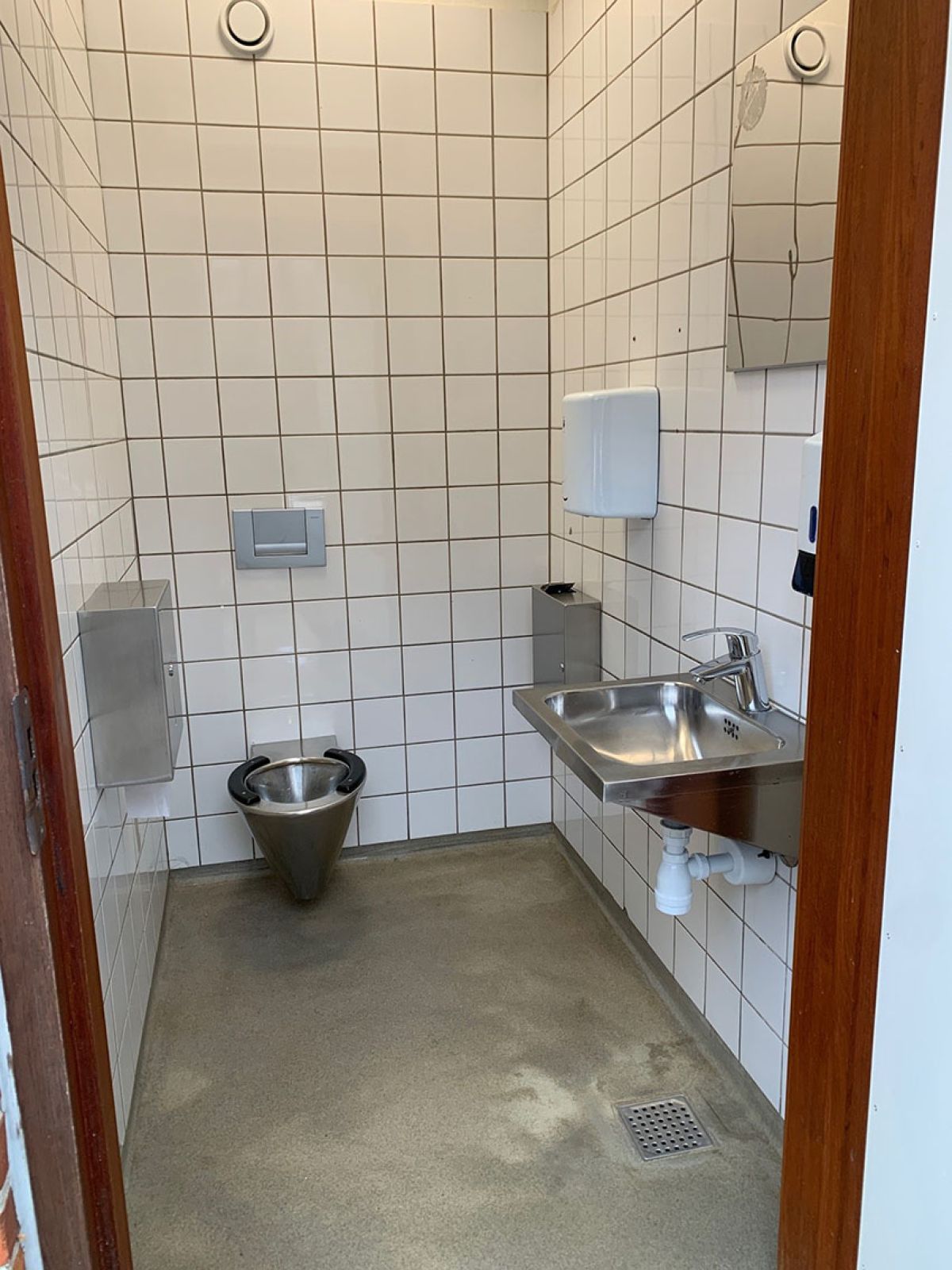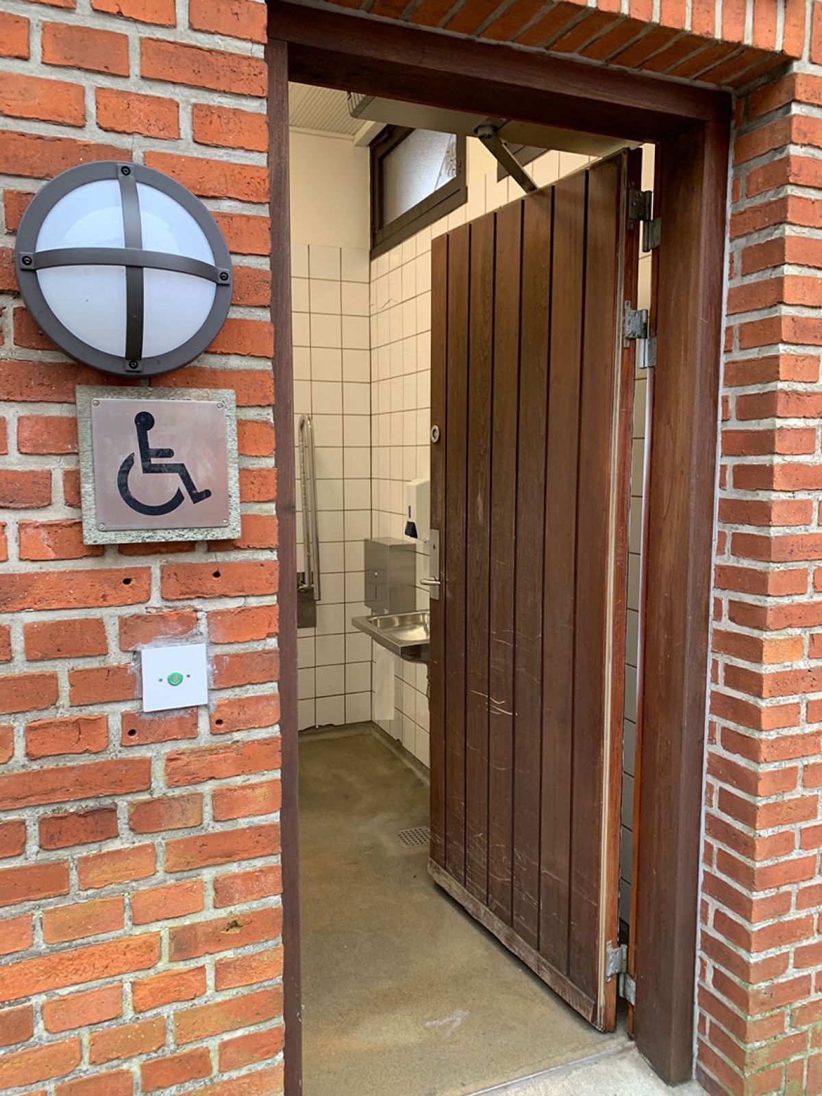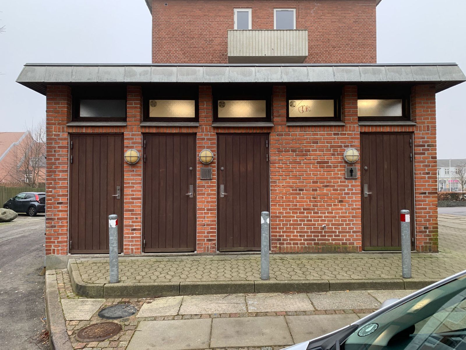Toiletbygningen er beliggende ved p-pladsen og overfor indgangen til Arnbjerg og Friluftsscenen