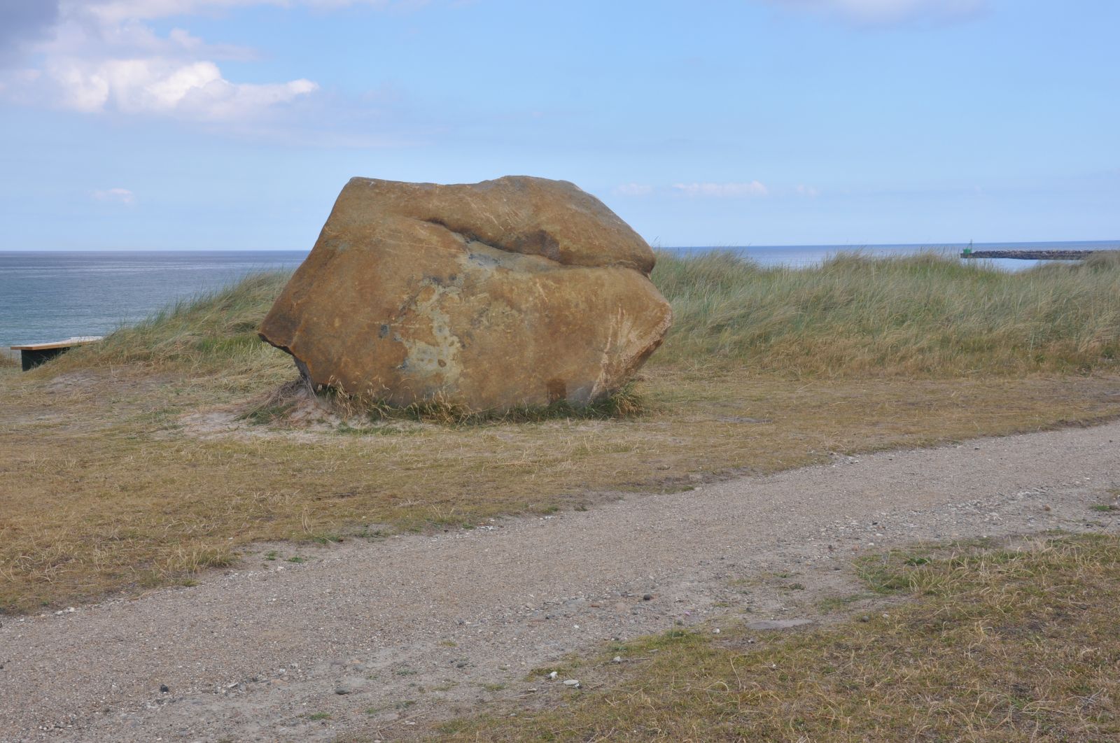 Udsigt ud over havet, samt det kuperede klitlandskab hvor Hirtshals Fyr kan ses til venstre på billedet. Underlaget er grus.
